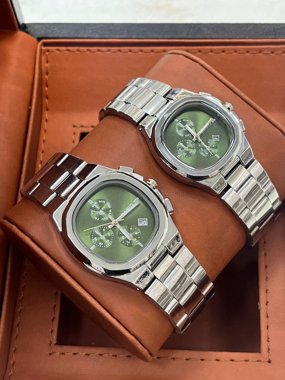 ست ساعت زنانه و مردانه بند استیل ساعت ها دارای روزشمار دو عدد دستبند کارتیر استیل و دو حلقه (سایز 6 تا 10) به همراه دو عدد جعبه کادویی و باتری یدکی
