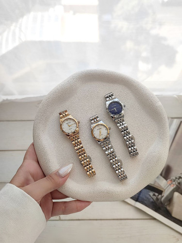 ست ساعت زنانه و مردانه برند الگانس بند استیل ساعت ها دارای روزشمار دو عدد دستبند کارتیر استیل و دو تا انگشتر کارتیر