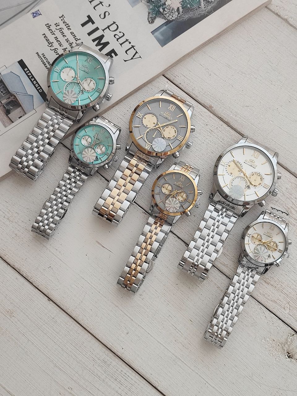 ست ساعت زنانه و مردانه مارک الگانس ELEGANCE Q1 125013501986 رنگ ثابت موتور ژاپن دو قفله مخفی دارای روز شمار طرح سه موتوره قاب و بند استیل کیفیت بسیار عالی همراه با جعبه شیک