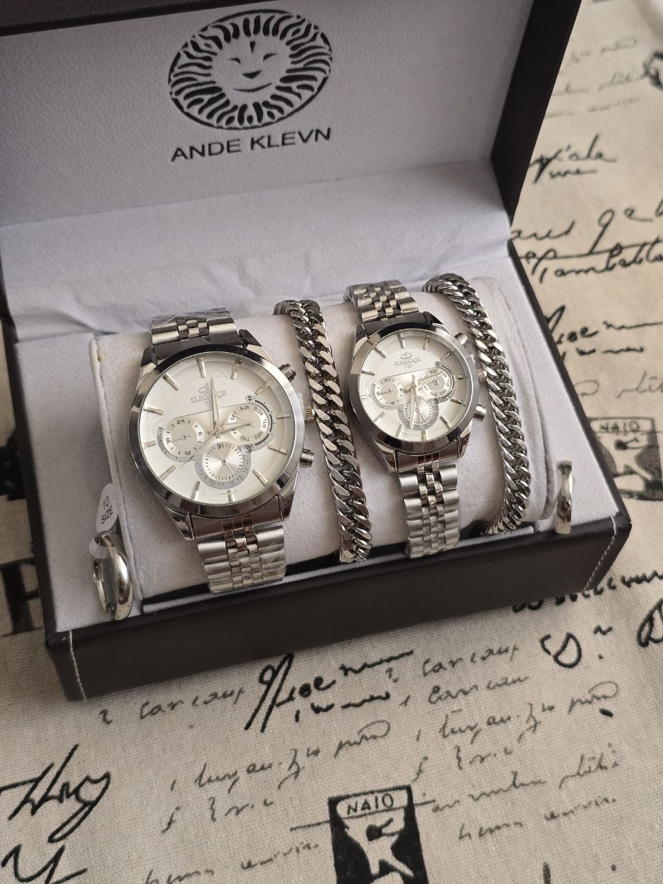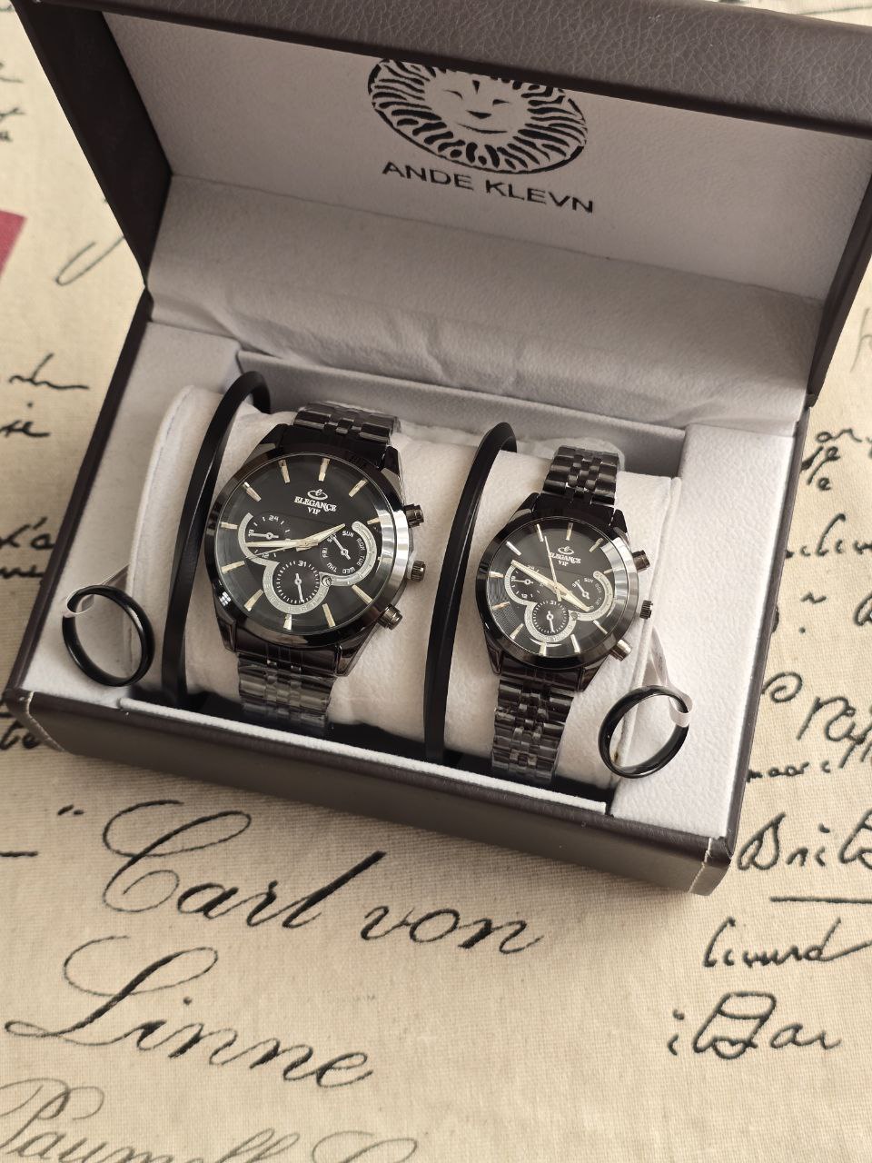 ست ساعت زنانه و مردانه برند الگانس ساعت ها دارای روزشمار دو عدد دستبند کارتیر استیل و دو تا انگشتر(سایز 6 تا 10) به همراه جعبه کادویی