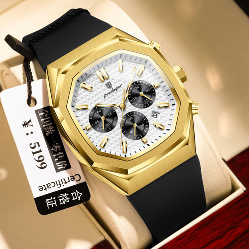 ساعت مردانه پوداگار poedagar مدلی نو کرنوگراف دارای روز شمار صفحه شب نما برند شرکتی بند رابر ضدآب شیشه معدنی رنگ ثابت قفل کمربندی موتور کوارتز
