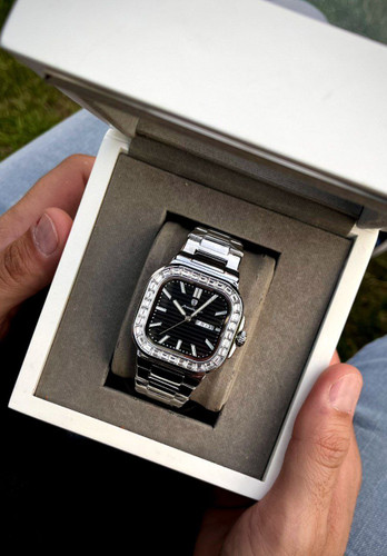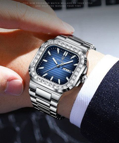 ساعت مردانه پوداگار مربعی خاص دارای روز شمار ایام هفته صفحه شب نما برند شرکتی بند استیل قطر صفحه ۴۲ میل ضدآب تا عمق بالا