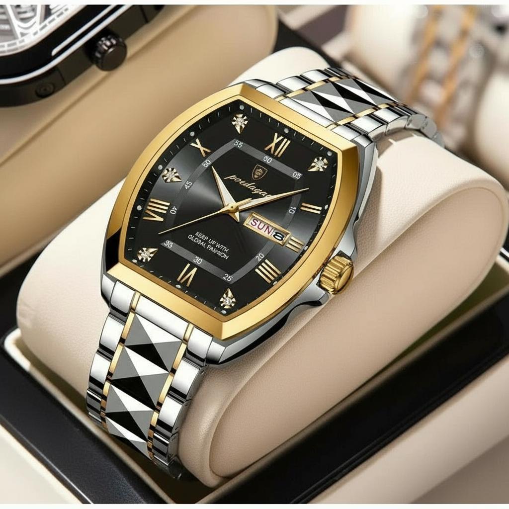ساعت مردانه پوداگار مربعی خاص دارای روز شمار ایام هفته صفحه شب نما برند شرکتی بند استیل قطر صفحه ۴۲ میل ضدآب تا عمق بالا