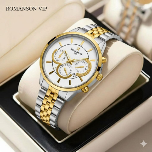 ساعت مردانه برند رومانسون ROMANSON باکیفیت بدنه استیل طراحی خاص و زیبا صفحه سفید موتور کوارتز روز شمار طرح سه موتوره
