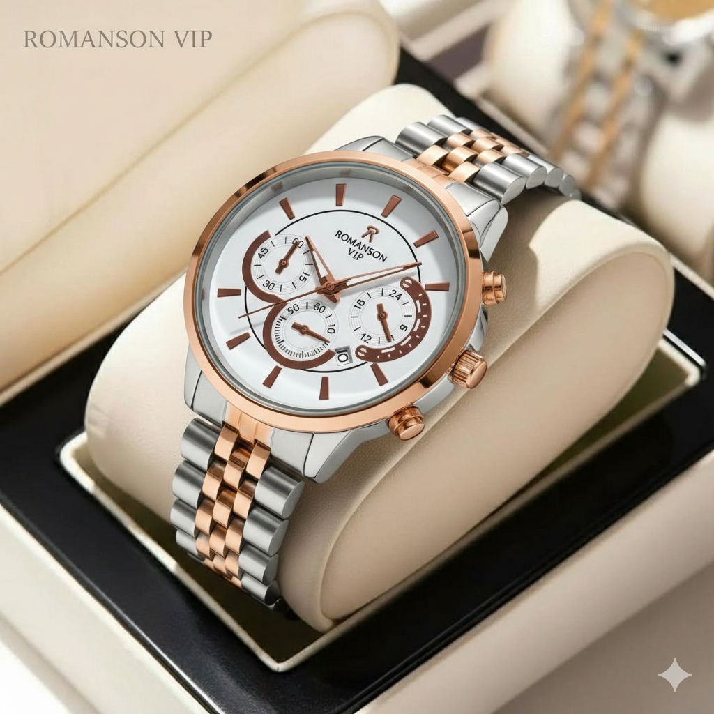 ساعت مردانه برند رومانسون ROMANSON باکیفیت بدنه استیل طراحی خاص و زیبا صفحه سفید موتور کوارتز روز شمار طرح سه موتوره