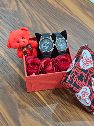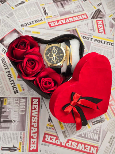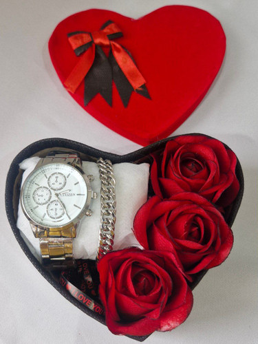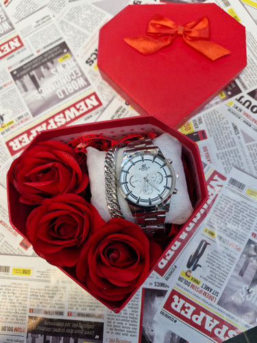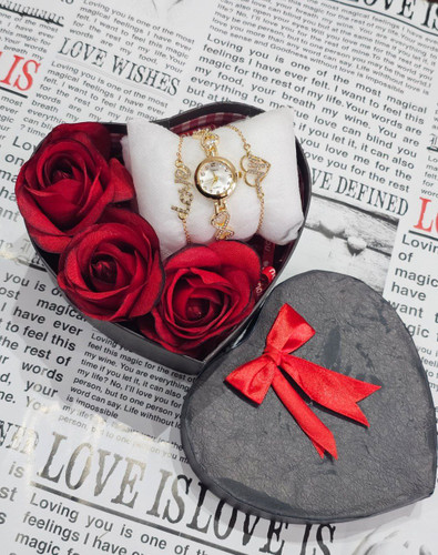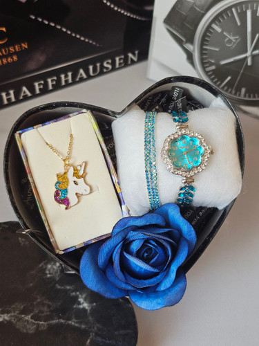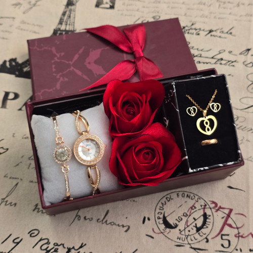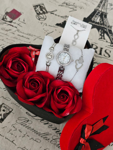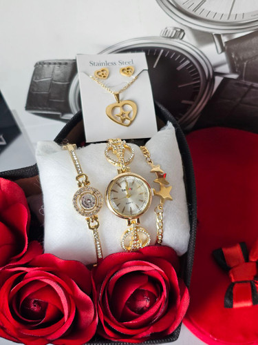 پک زنانه و دخترانه ساعت و دستبند و نیمست استیل و حلقه بهمراه باکس و گل مصنوعی