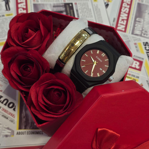 ست ساعت کاسیو و دستبند و گردنبند و انگشتر قرمز به همراه جعبه کادویی و باتری یدکی