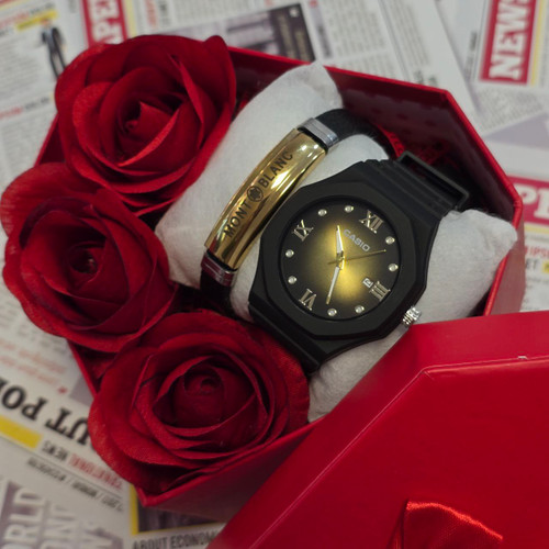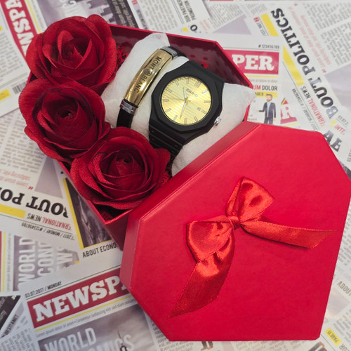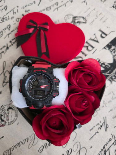 باکس هدیه مردانه ساعت کاسیو طرح جیشاک دو زمانه آنالوگ و دیجیتال نمایش ایام هفته و روزشمار ماه دارای آلارم و نور پس زمینه بهمراه باکس و گل مصنوعی