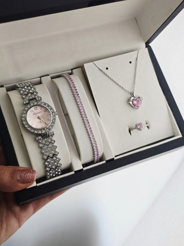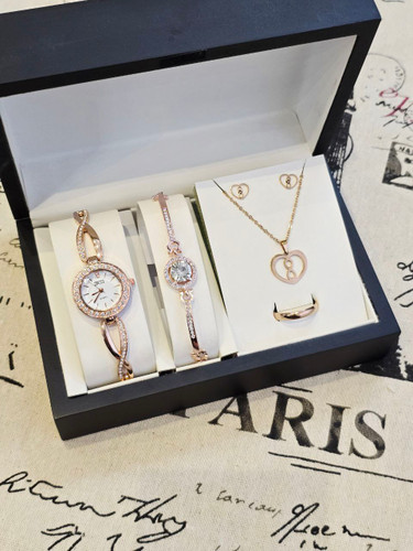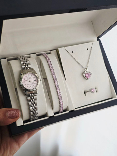 ست زنانه و دخترانه ساعت و دستبند و گردنبند و انگشتر بهمراه جعبه کادویی و باتری یدکی