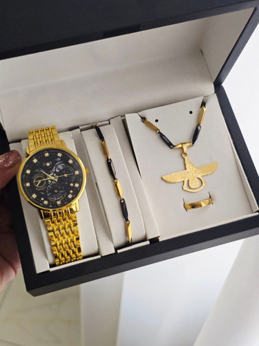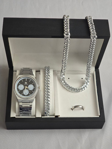 ست مردانه و پسرانه ساعت و دستبند و گردنبند و انگشتر بهمراه جعبه کادویی و باتری یدکی