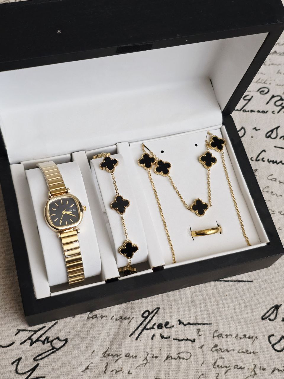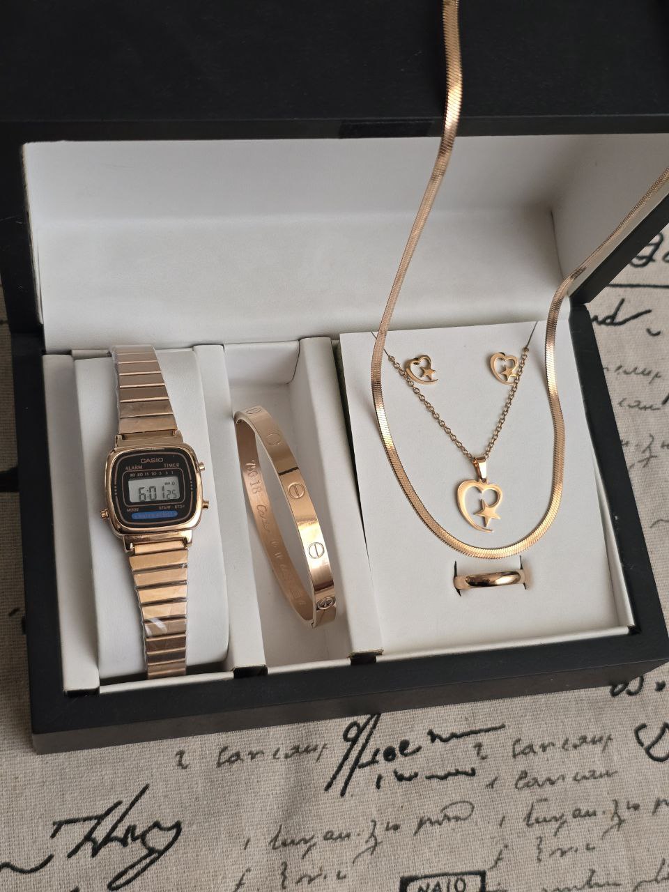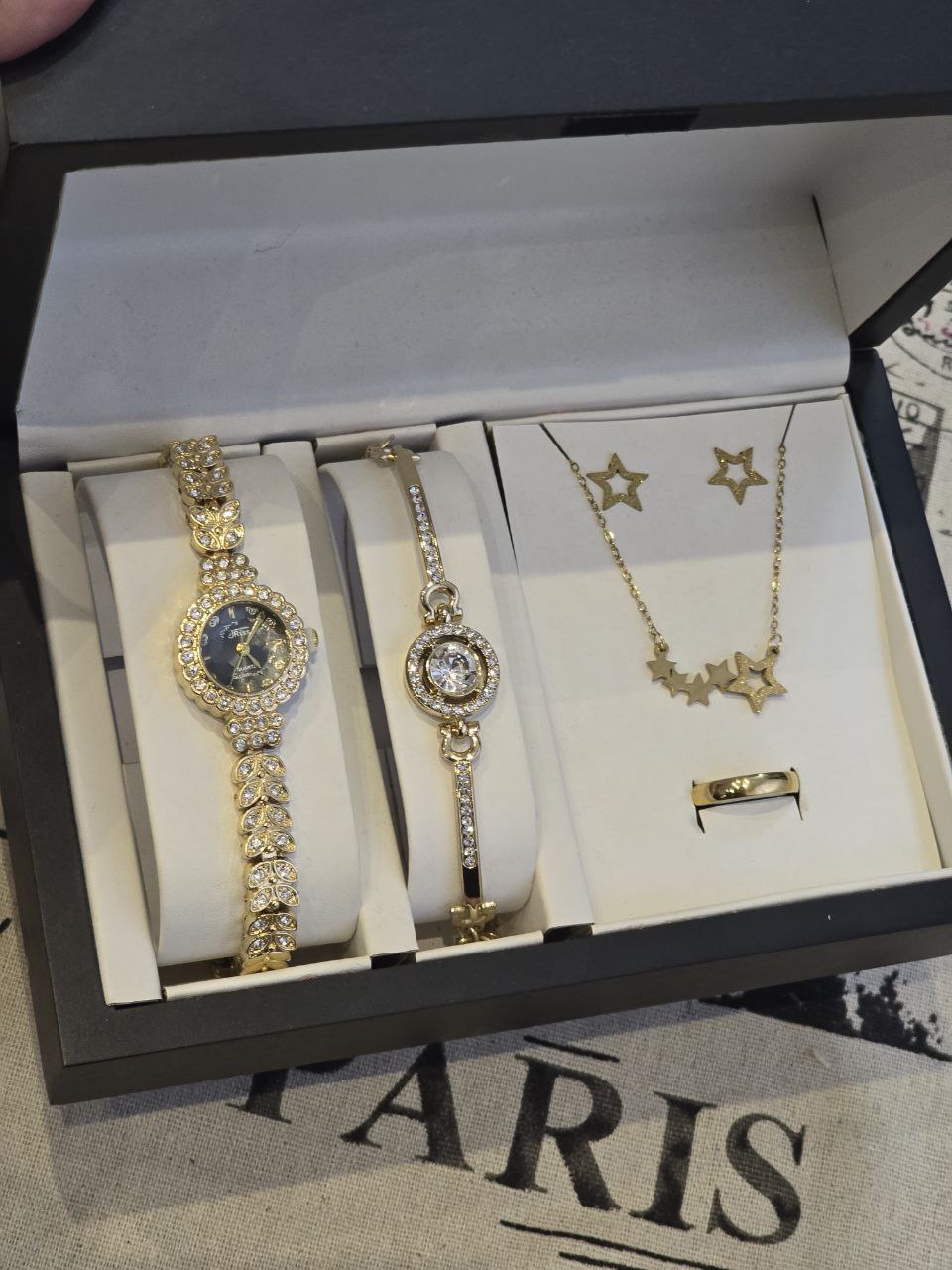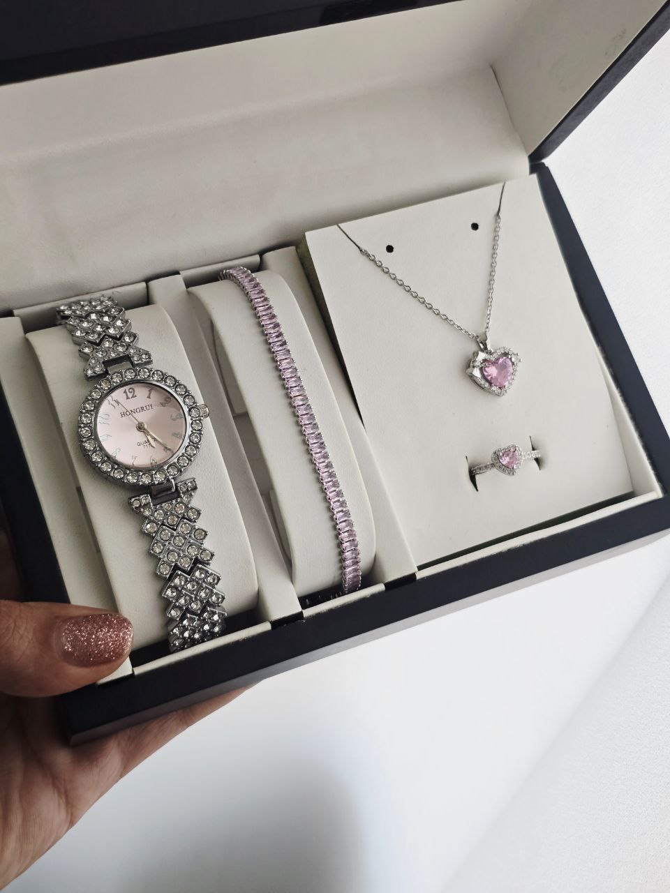ست زنانه و دخترانه ساعت و دستبند و گردنبند و انگشتر بهمراه جعبه کادویی و باتری یدکی