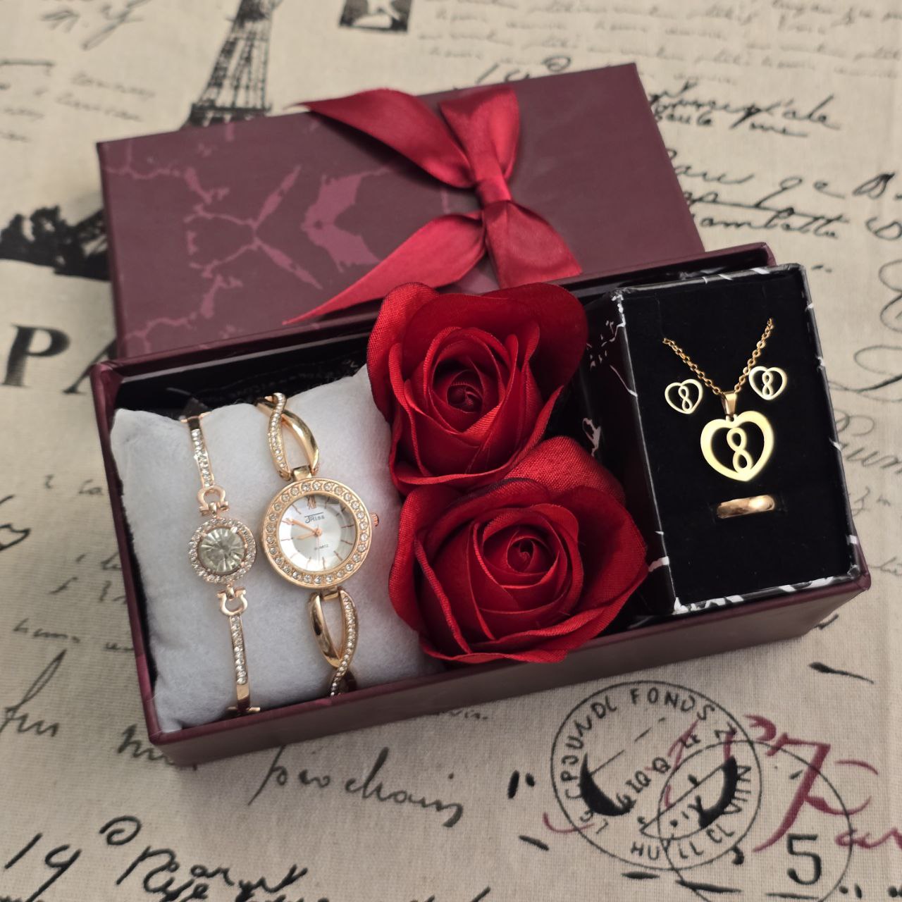پک زنانه و دخترانه ساعت و دستبند و نیمست استیل و حلقه بهمراه باکس و گل مصنوعی
