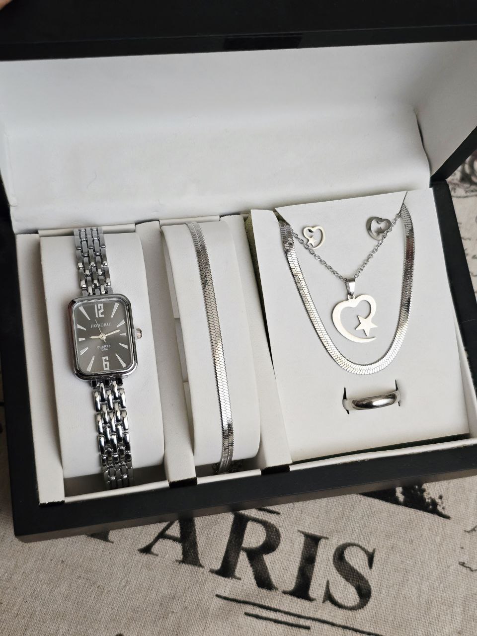 ست زنانه و دخترانه ساعت و دستبند و نیمست استیل و حلقه بهمراه جعبه کادویی و باتری یدکی