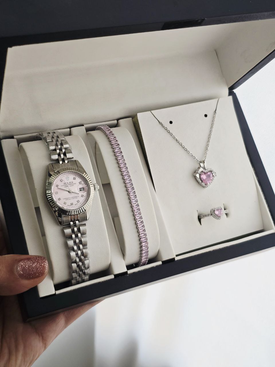 ست زنانه و دخترانه ساعت رولکس و دستبند و گردنبند و انگشتر بهمراه جعبه کادویی و باتری یدکی