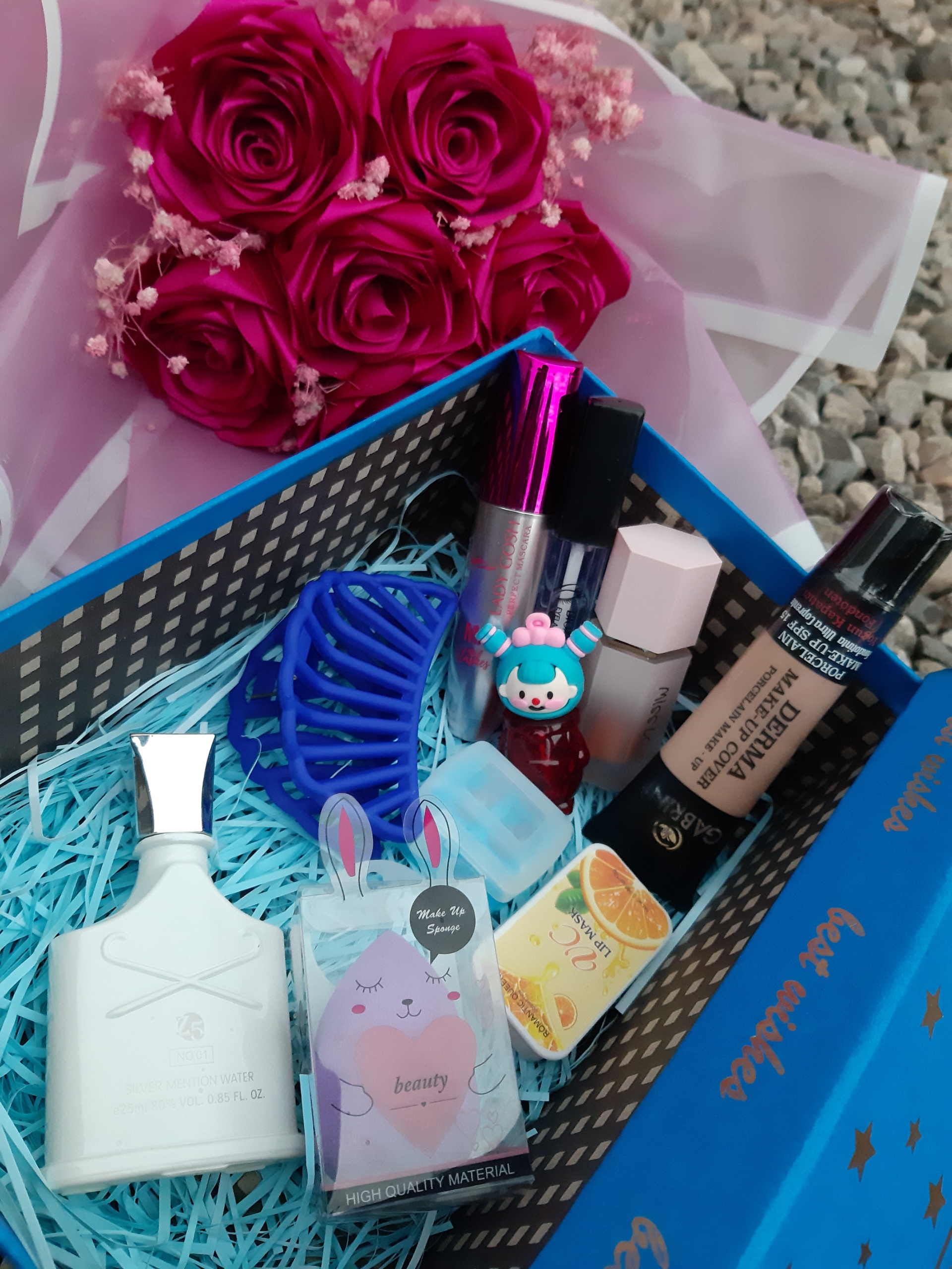 باکس هدیه زنانه شیک به همراه وسایل لوکس شامل رژگونه پددار کرم پودر گابرینی پد تخم مرغی کلیپس ادکلن چرب لب پرتقالی تینت عروسکی ریمل حجم دهنده تقویت مژه تراش دو قلو