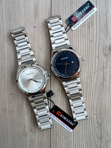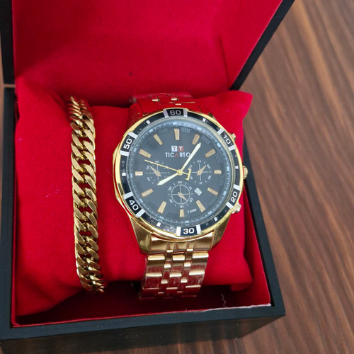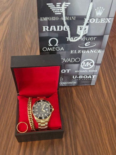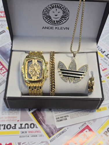 ست ساعت و دستبند و گردنبند ساعت دو تقویم فعال ماه و ایام هفته به همراه دستبند و گردنبند و حلقه استیل و جعبه کادویی و باتری یدکی