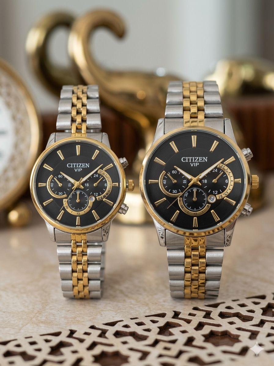ست ساعت زنانه مردانه برند CITIZEN تعداد محدود ❌ قفل کلیپسی موتور کوارتز باکیفیت طراحی خاص و زیبا دارای روز شمار بنداستیل طرح کرنوگراف