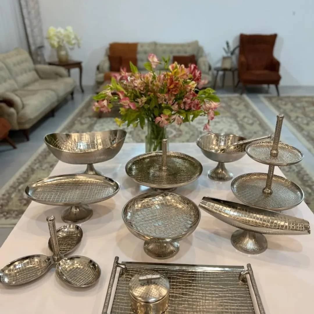 سرویس کامل پذیرایی لوتوس ریحان😍 شامل :ظرف میوه،ظرف شیرینی،ظرف آجیل و شکلات✅ جنس آلومینیوم درجه یک براق ✅