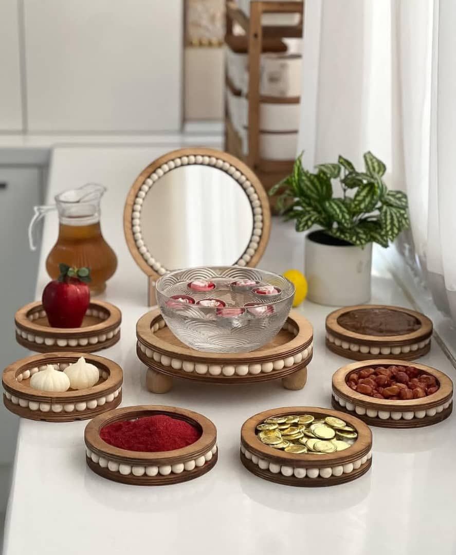 هفت سین مهره دارریجان 😍🪻 جنس چوب قابل شستشو ✅ کیفیت چوب درجه یک 🤌🏼💯(۶عدد پیاله، ۱عدد ظرف بزرگ، ۱ عدد اینه پایه دار)