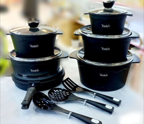 سرویس قابلمه تونیش ریحان👌🏼😍 سرویس 15 پارچه چدن (گرانیت )✅ فقط رنگ مشکی ✅ 🔵قابلمه سایز : 20_24_28_32 🔵تابه سایز : 28 و تابه رژیمی 🔵به همراه سه عدد کفگیر ملاقه اولترامید نسوز