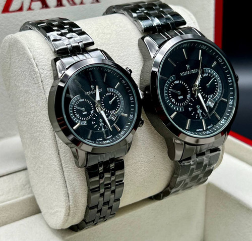 ست ساعت زنانه و مردانه بند استیل ساعت ها دارای روزشمار دو عدد دستبند کارتیر استیل و دو حلقه (سایز 6 تا 10) به همراه دو عدد جعبه کادویی و باتری یدکی