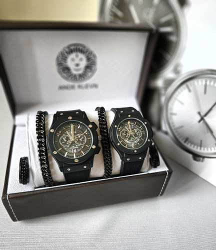 ست ساعت و دستبند و گردنبند ساعت دو تقویم فعال ماه و ایام هفته به همراه دستبند و گردنبند و حلقه استیل و جعبه کادویی و باتری یدکی