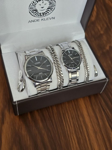 ست ساعت و دستبند و گردنبندساعت بند استیل به همراه دستبند و گردنبند و حلقه استیل و جعبه کادویی و باتری یدکی