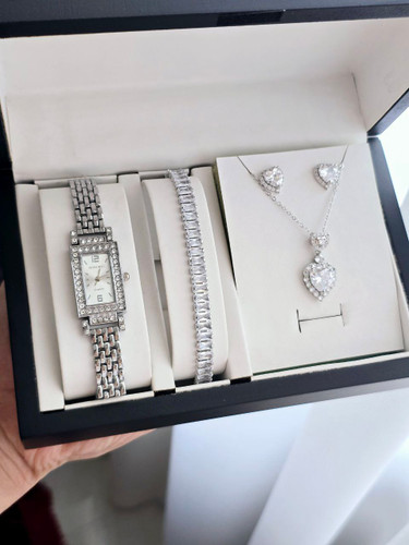 ست ساعت و دستبند و نیم ست استیل و رینگ ساعت نگینی مجلسی زنانه بهمراه جعبه کادویی و باتری یدکی
