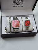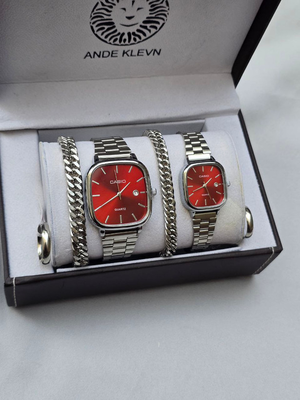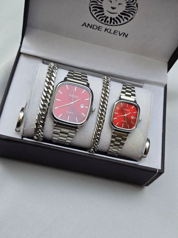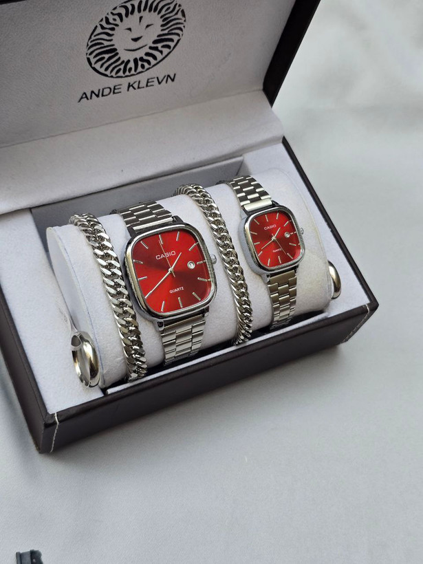 ست ساعت زنانه و مردانه بند استیل ساعت ها دارای روزشمار دو عدد دستبند کارتیر استیل و دو حلقه (سایز 6 تا 10) به همراه دو عدد جعبه کادویی و باتری یدکی