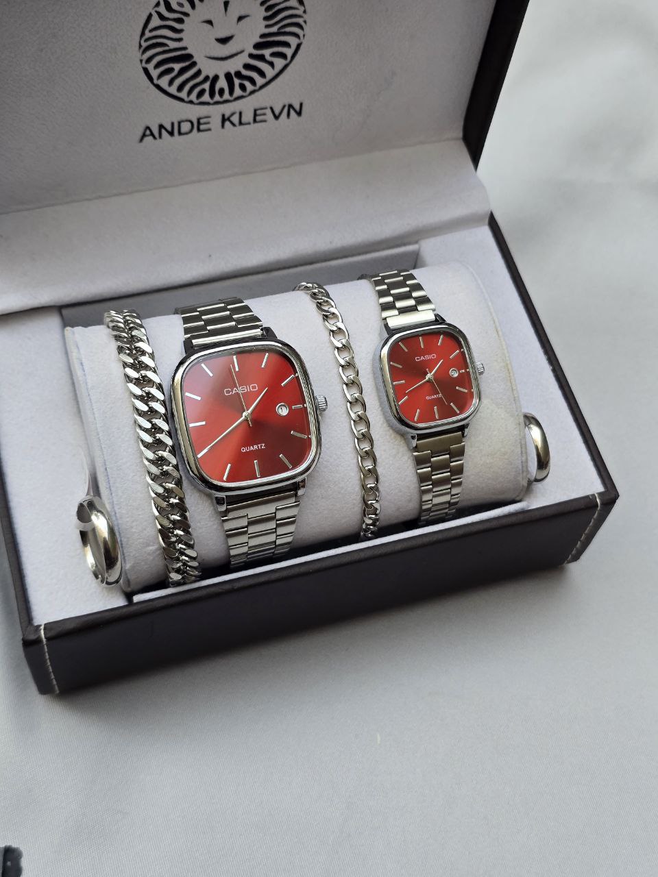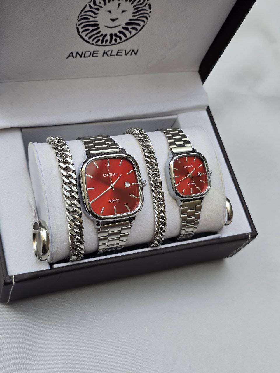 ست ساعت زنانه و مردانه بند استیل ساعت ها دارای روزشمار دو عدد دستبند کارتیر استیل و دو حلقه (سایز 6 تا 10) به همراه دو عدد جعبه کادویی و باتری یدکی