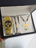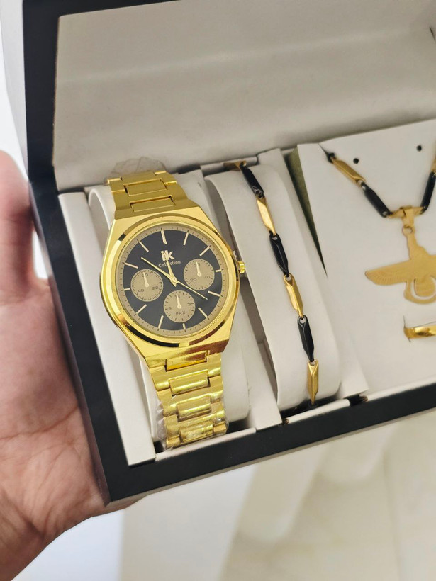 ست مردانه و پسرانه ساعت و دستبند و گردنبند و انگشتر بهمراه جعبه کادویی و باتری یدکی
