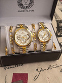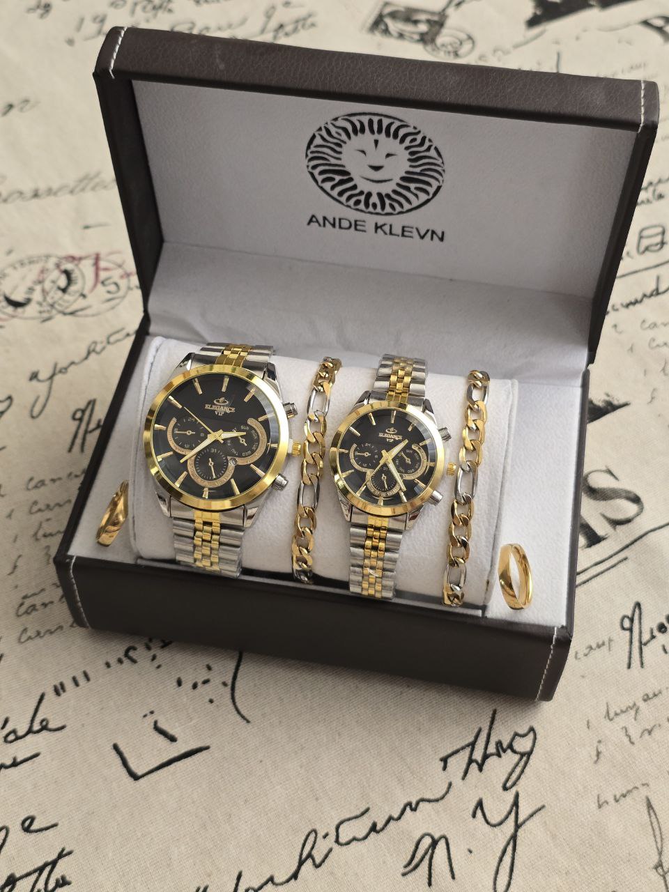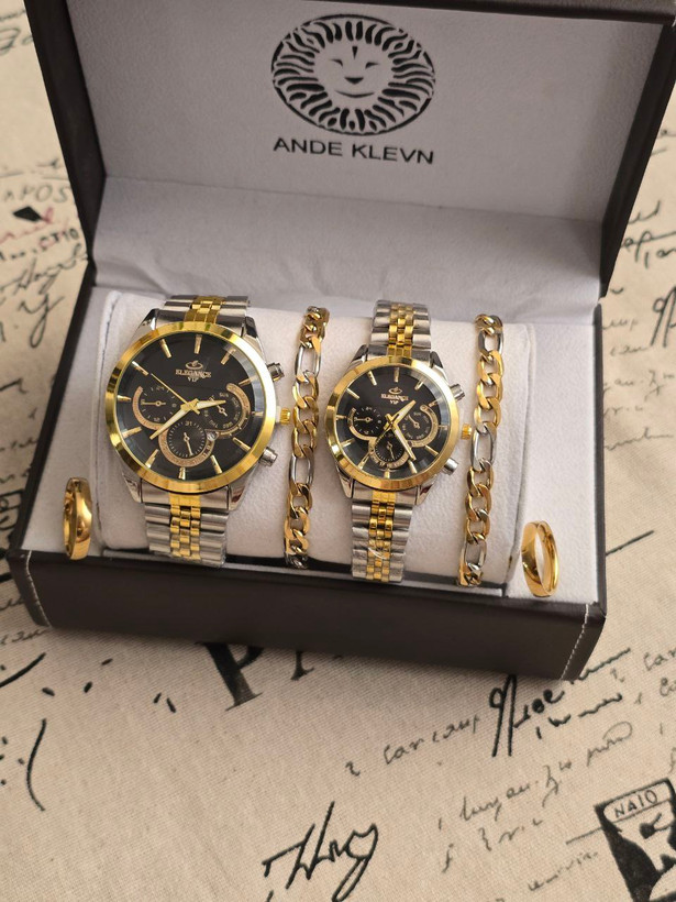 ست ساعت زنانه و مردانه برند الگانس ساعت ها دارای روزشمار دو عدد دستبند کارتیر استیل و دو تا انگشتر(سایز 6 تا 10) به همراه جعبه کادویی