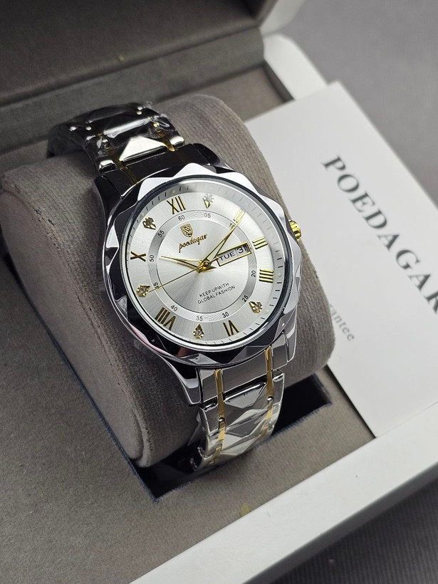 ⌚️پوداگار مدلی نو دارای روز شمار و ایام هفته صفحه شب نما برند شرکتی طرح الماس بند استیل مقاوم در برابراّب رنگ ثابت قفل پروانه ای موتور کوارتز