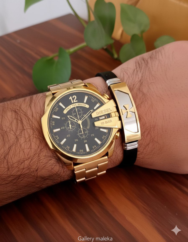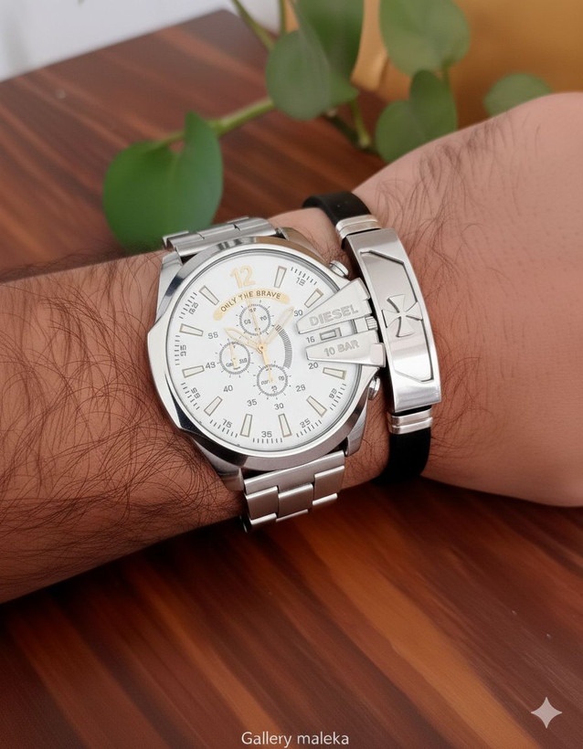 مشخصات کلی محصول🌈ست مردانه ساعت مارک دیزل شاخدار ☑️☑️Diesel for men ✅طرح کرنو ✅به همراه دستبند چرمی پلاک دار استیل ✅بهترین گزینه برای کادو و هدیه 🎁به همراه جعبه کادویی