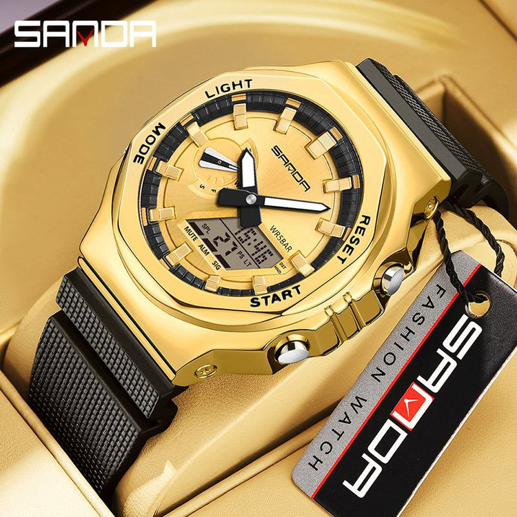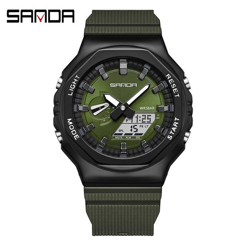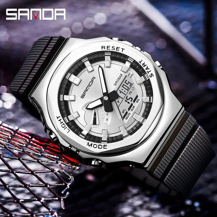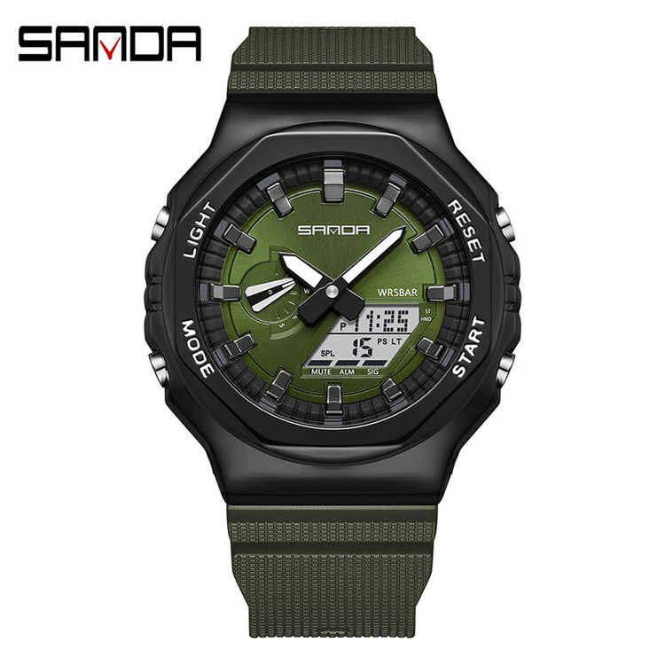 مشخصات کلی محصول: برند / SANDA ♻️ عقربه کوچک فعال ♻️ روز شمار دار ، ایام هفته ، آلارم ، بک لایت و... ♻️ دو زمانه ♻️ بند سیلیکونی ♻️ قطر 46 میلی متر