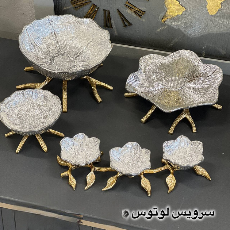 مشخصات کلی محصول: سرویس کامل پذیرایی لوتوس😍 شامل :ظرف میوه،ظرف شیرینی،ظرف آجیل و شکلات✅ جنس آلومینیوم درجه یک براق ✅