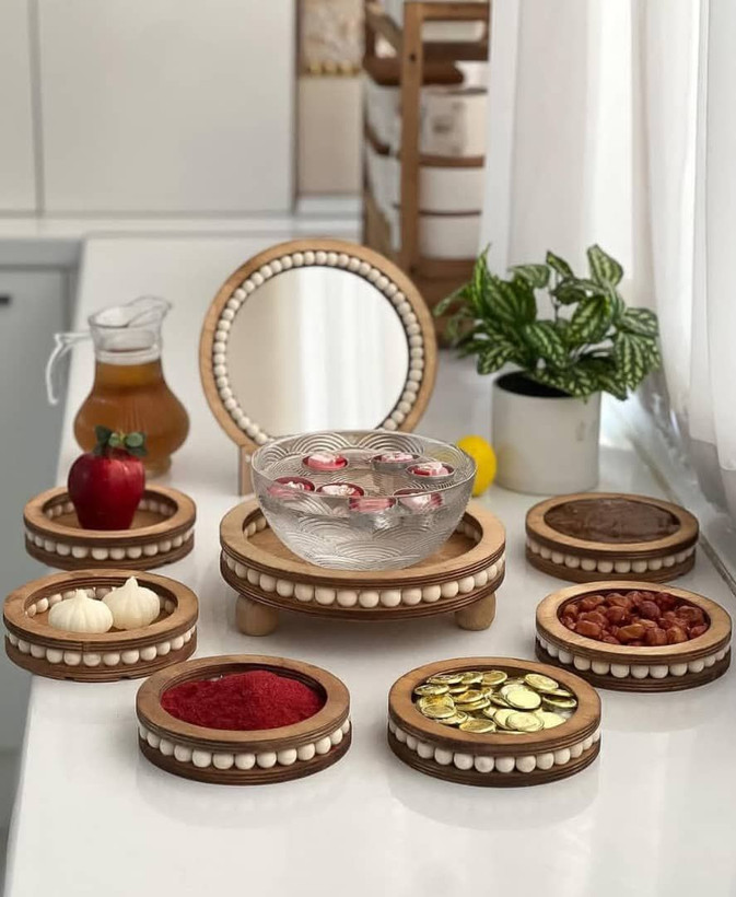 مشخصات کلی محصولهفت سین مهره دار 😍🪻 جنس چوب قابل شستشو ✅ کیفیت چوب درجه یک 🤌🏼💯(۶عدد پیاله، ۱عدد ظرف بزرگ، ۱ عدد اینه پایه دار)