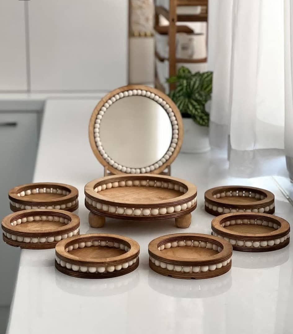 مشخصات کلی محصول: هفت سین مهره دار 😍🪻 جنس چوب قابل شستشو ✅ کیفیت چوب درجه یک 🤌🏼💯(۶عدد پیاله، ۱عدد ظرف بزرگ، ۱ عدد اینه پایه دار)