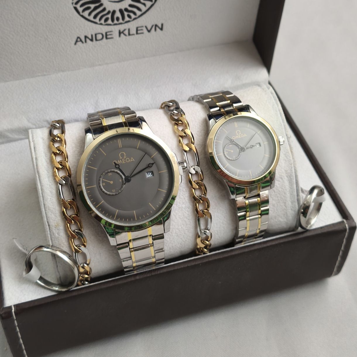 ست ساعت زنانه و مردانه بند استیل ساعت ها دارای روزشمار دو عدد دستبند و حلقه (سایز 6 تا 10) به همراه جعبه کادویی و باتری یدکی