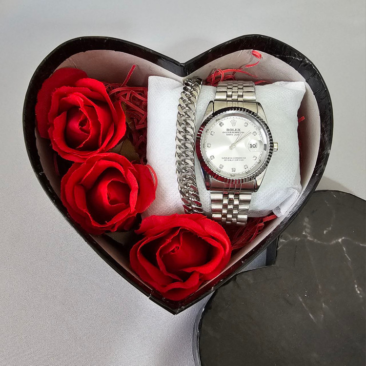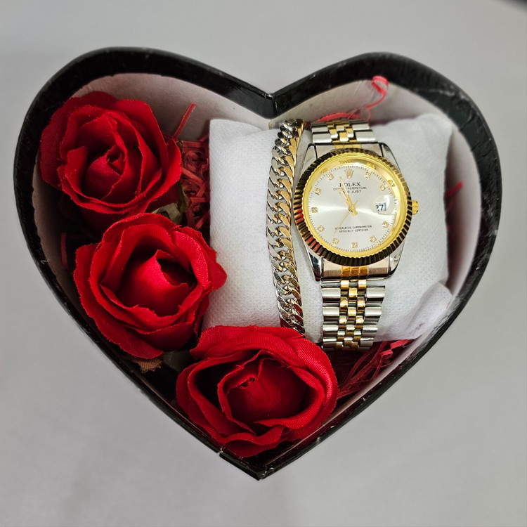 🔸️اقلام باکسساعت رولکس بند استیل طلایی اندازه صفحه ۳۵ میلیمتر بهمراه یک عدد دستبند استیل و باکس هدیه و گل