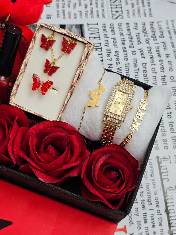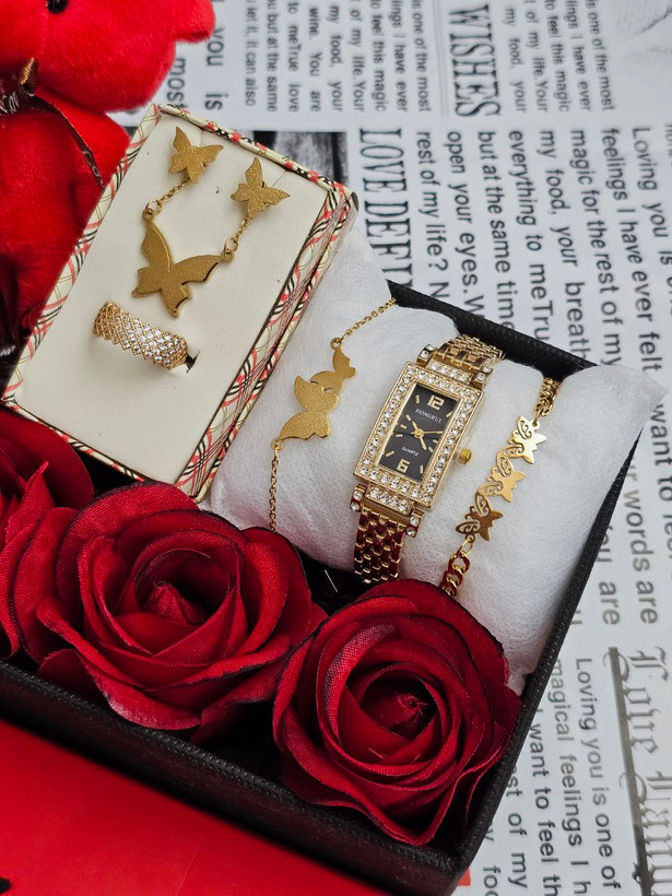 ست کامل با نیم ست پروانه رنگ قرمز و ساعت صفحه طلایی