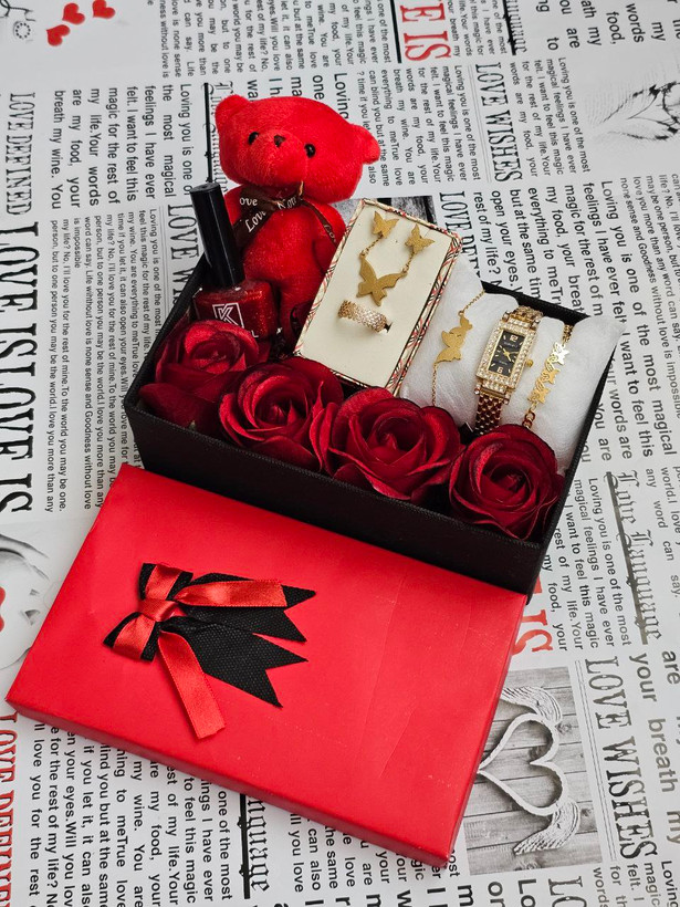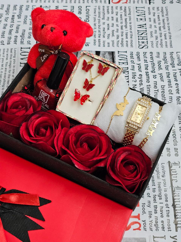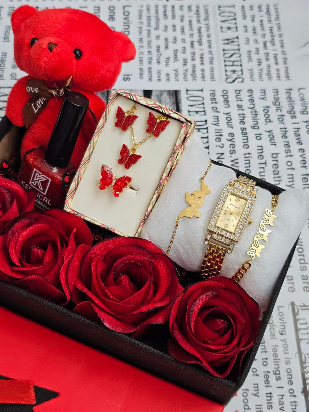 ست کامل با نیم ست پروانه رنگ قرمز و ساعت صفحه مشکی