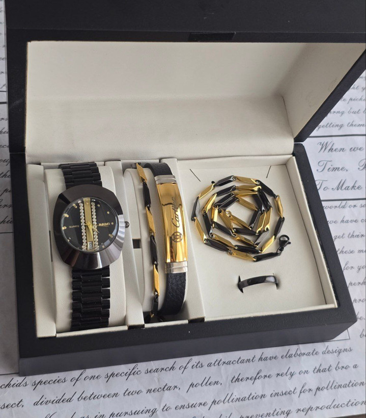 ست مردانه ساعت رادو تقویم دار بند استیل به همراه دو عدد دستبند و گردنبند استیل و حلقه و جعبه کادویی و باتری یدکی