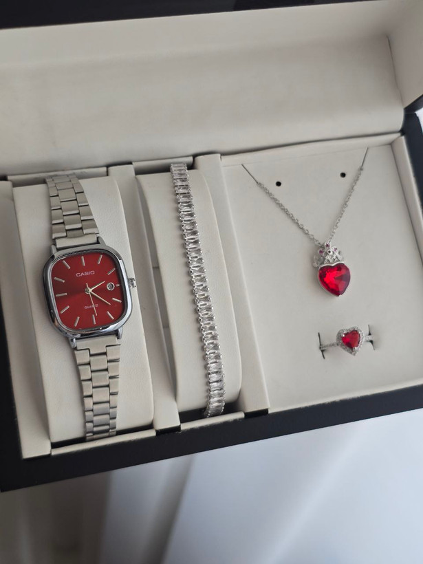 ست ساعت کاسیو و دستبند و گردنبند و انگشتر قرمز به همراه جعبه کادویی و باتری یدکی