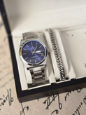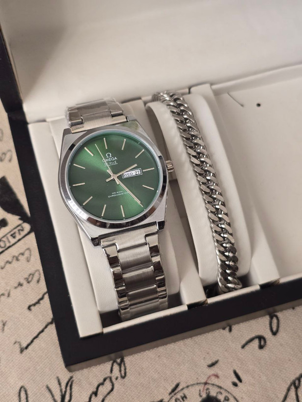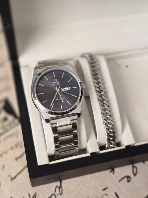 ست ساعت امگاOMEGA مردانه به همراه دستبند قفل پروانه ای استیل