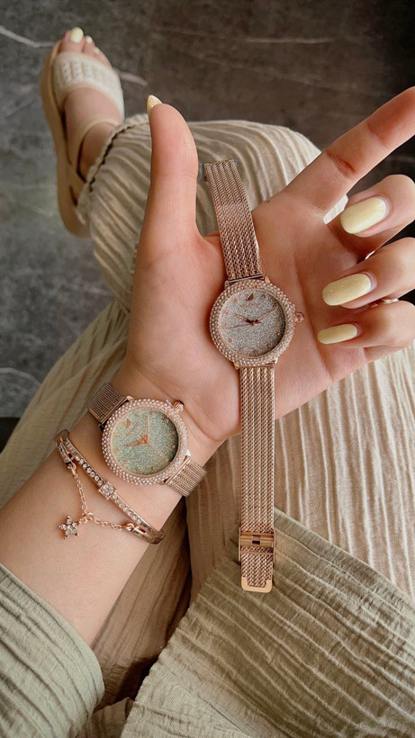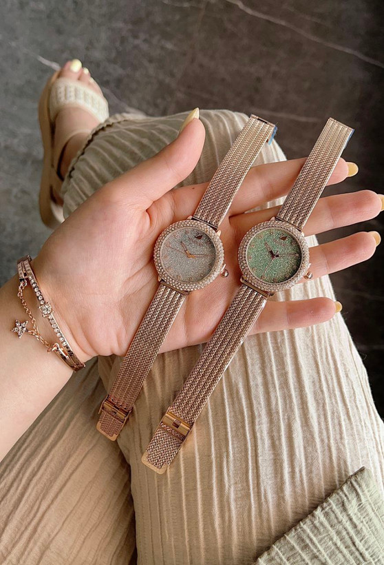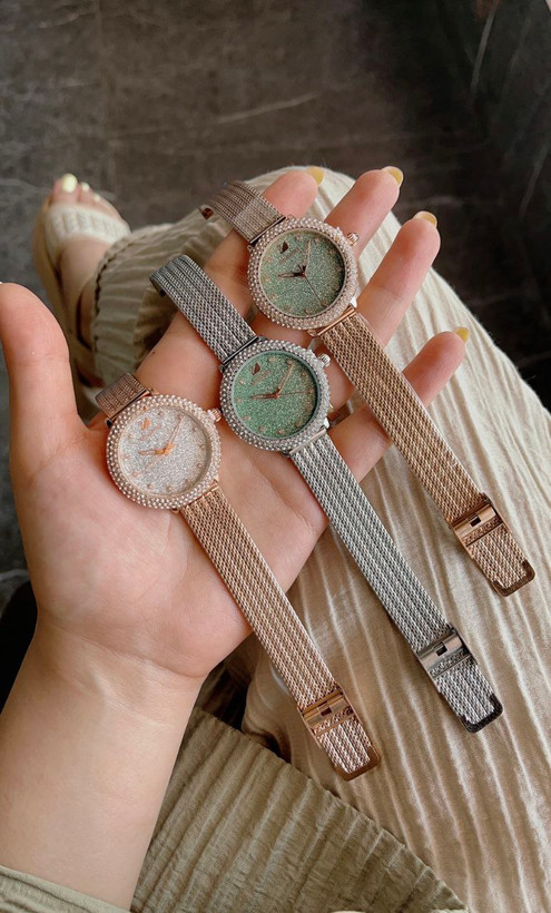 ساعت زنونه سواروسکیSWAROVSKIقفل ریلی بند استیل موتور کوارتز صفحه کهکشانی قاب نگینی