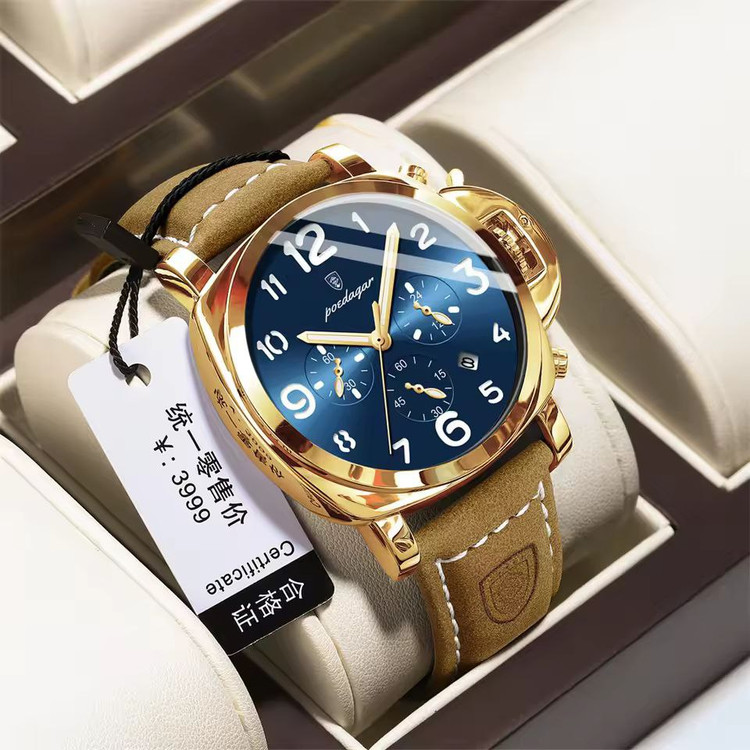 ساعت سه موتوره فعال برند پوداگار مردانه قطر 45 میلی متر رنگ ثابت ضدآب قاب استیل بند چرم