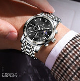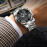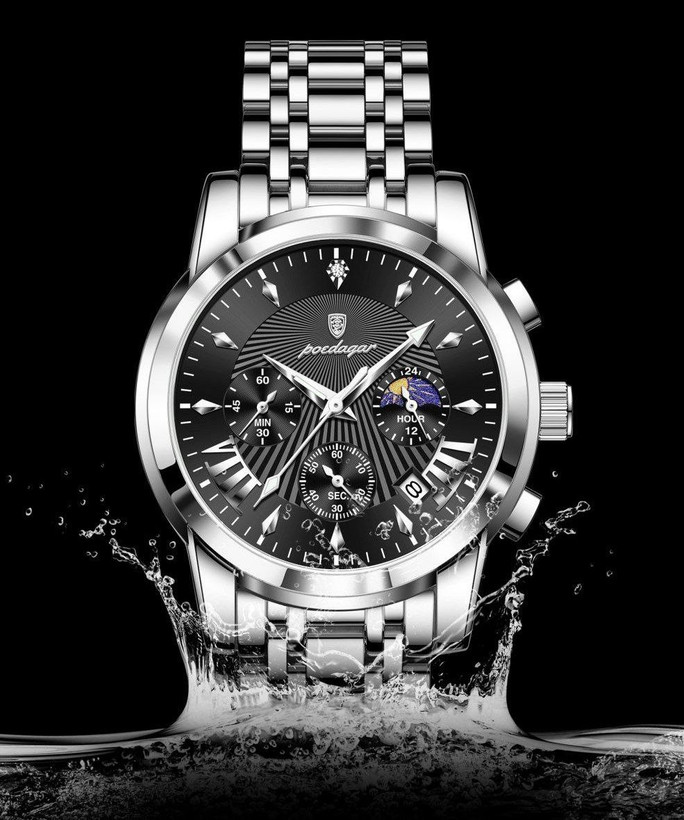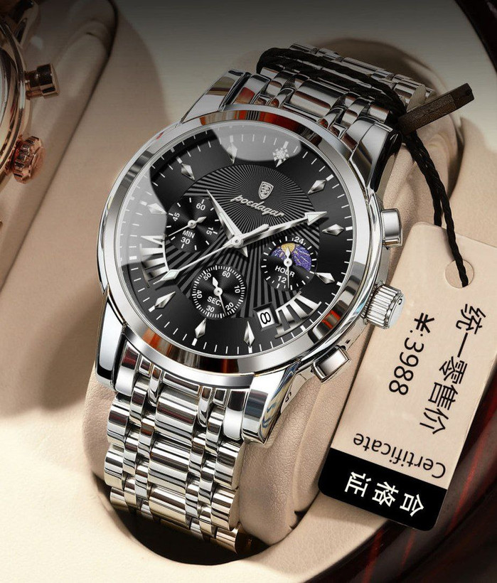 ساعت پوداگار مردانه کرنوگراف دارای روز شمار نمایش مون استار   عقربه شب نما برند اورجینال شرکتی بند استیل ضدآب تا عمق بالا رنگ ثابت قفل دو پروانه