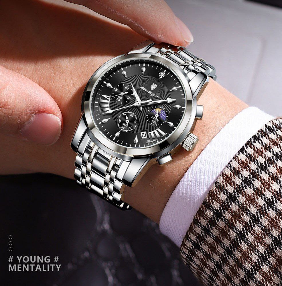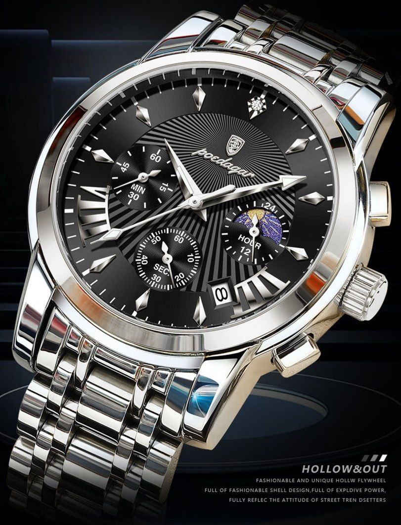 ساعت پوداگار مردانه کرنوگراف دارای روز شمار نمایش مون استار   عقربه شب نما برند اورجینال شرکتی بند استیل ضدآب تا عمق بالا رنگ ثابت قفل دو پروانه