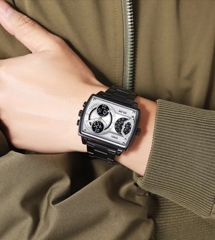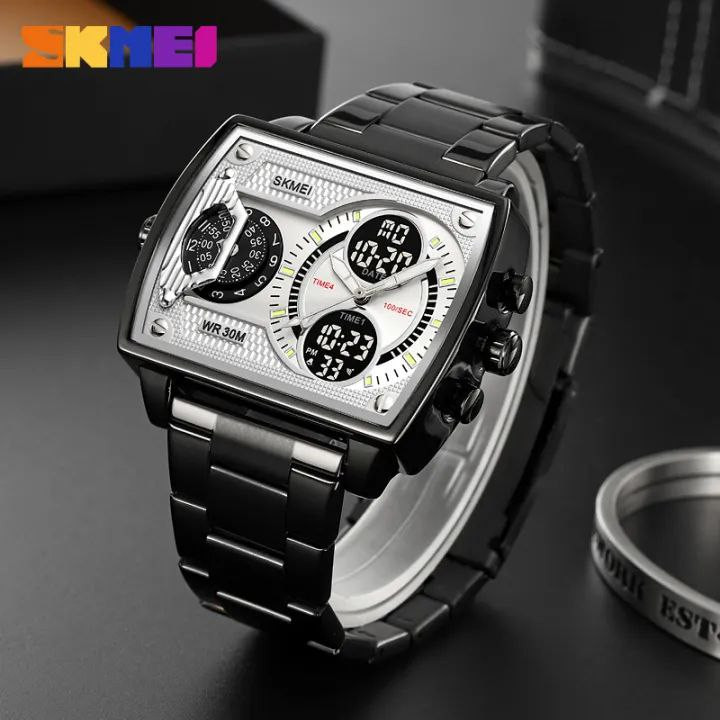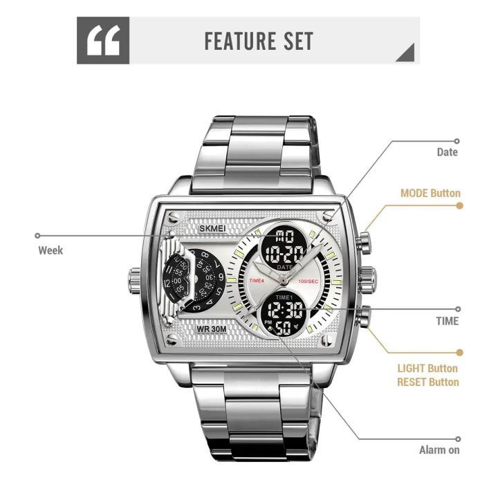 ساعت دو زمانه فلزی مارک اسکمی 2229 دوزمانه رنگ ثابت ضد اب الارم دار هک مارک روی قفل